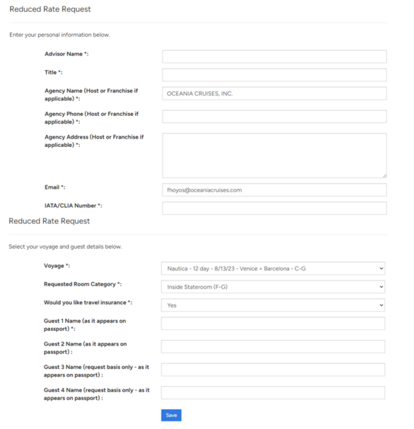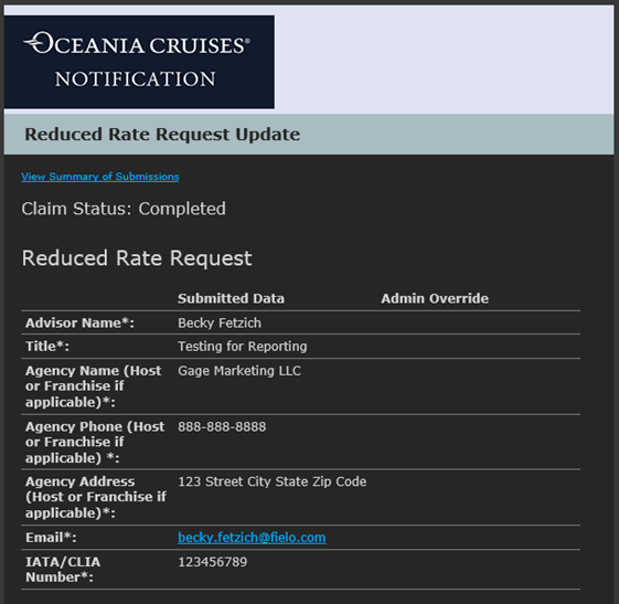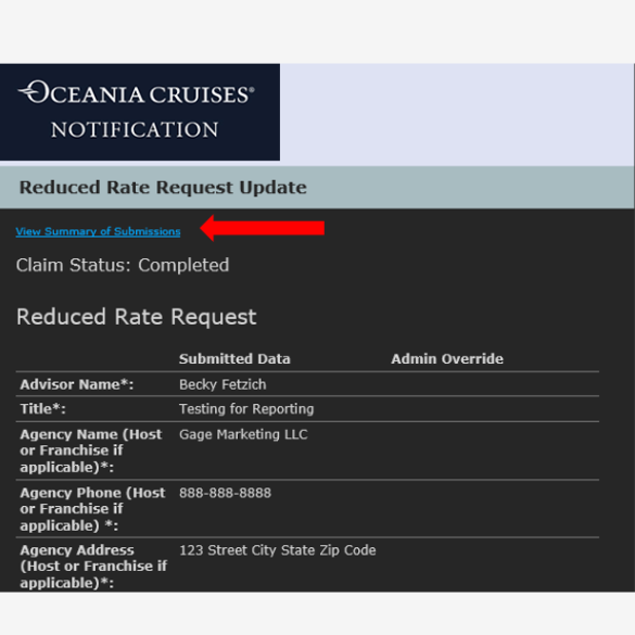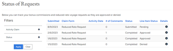 4. When the request is approved or denied, an email will be auto sent to the Advisor with the status update. If the request is approved, then an additional email with booking information will be sent from the Reduced Rates team. If your request has been denied, please go back into the portal, and submit for another sailing.